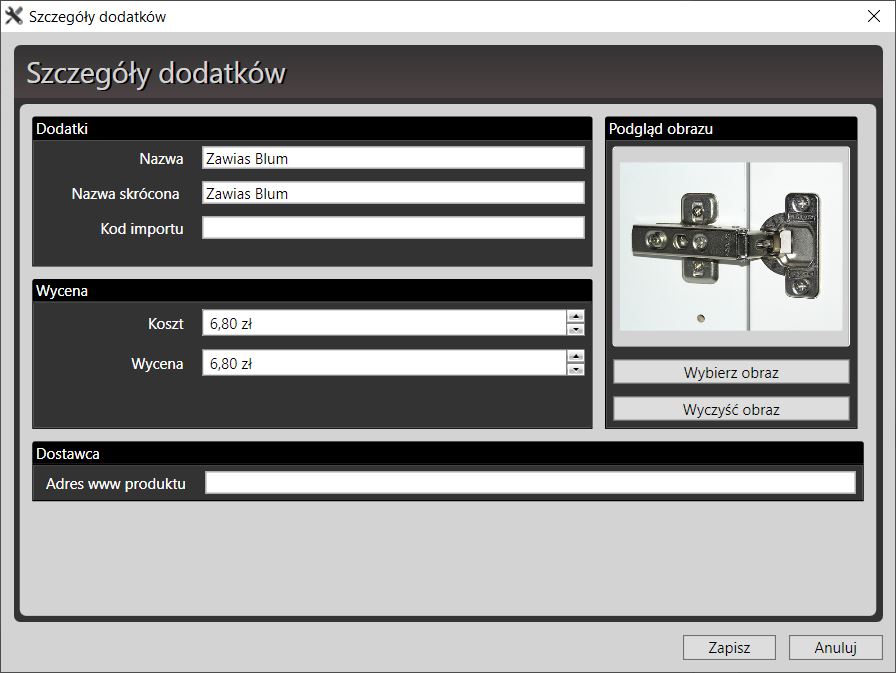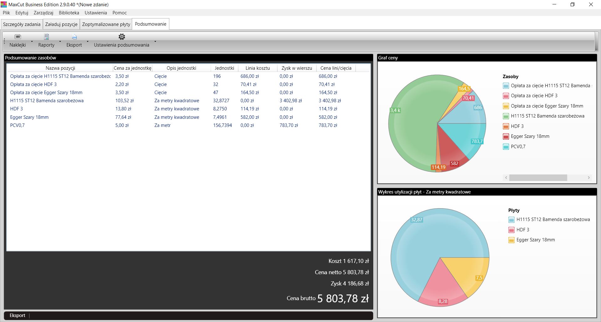 MaxCut pozwala na zdefiniowanie kosztów zakupu oraz zakładanej ceny sprzedaży. Uwzględnia takie parametry jak koszty cięcia od metra bieżącego, długość okleiny, czy nawet koszty dostawy.