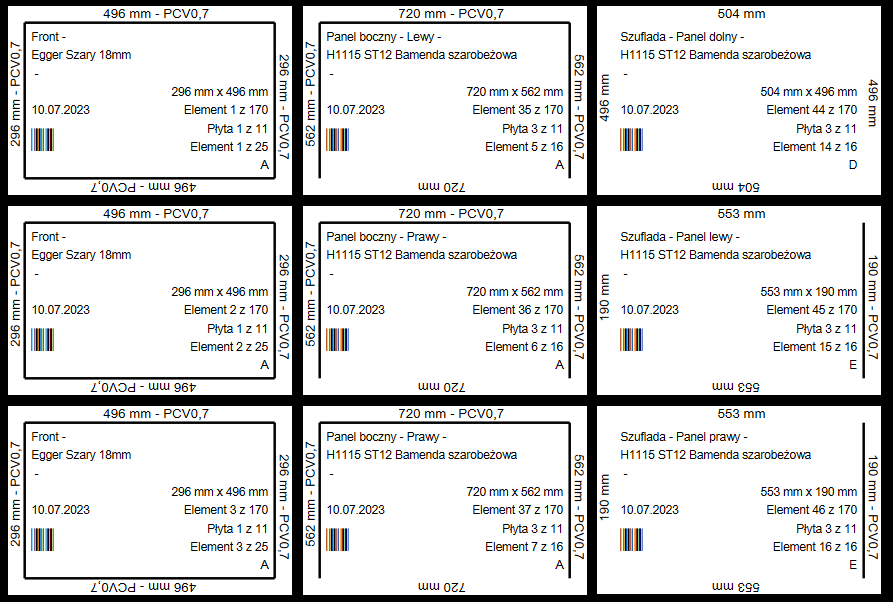 Nalepki elementów z płyty wraz z zaznaczeniem okleiny