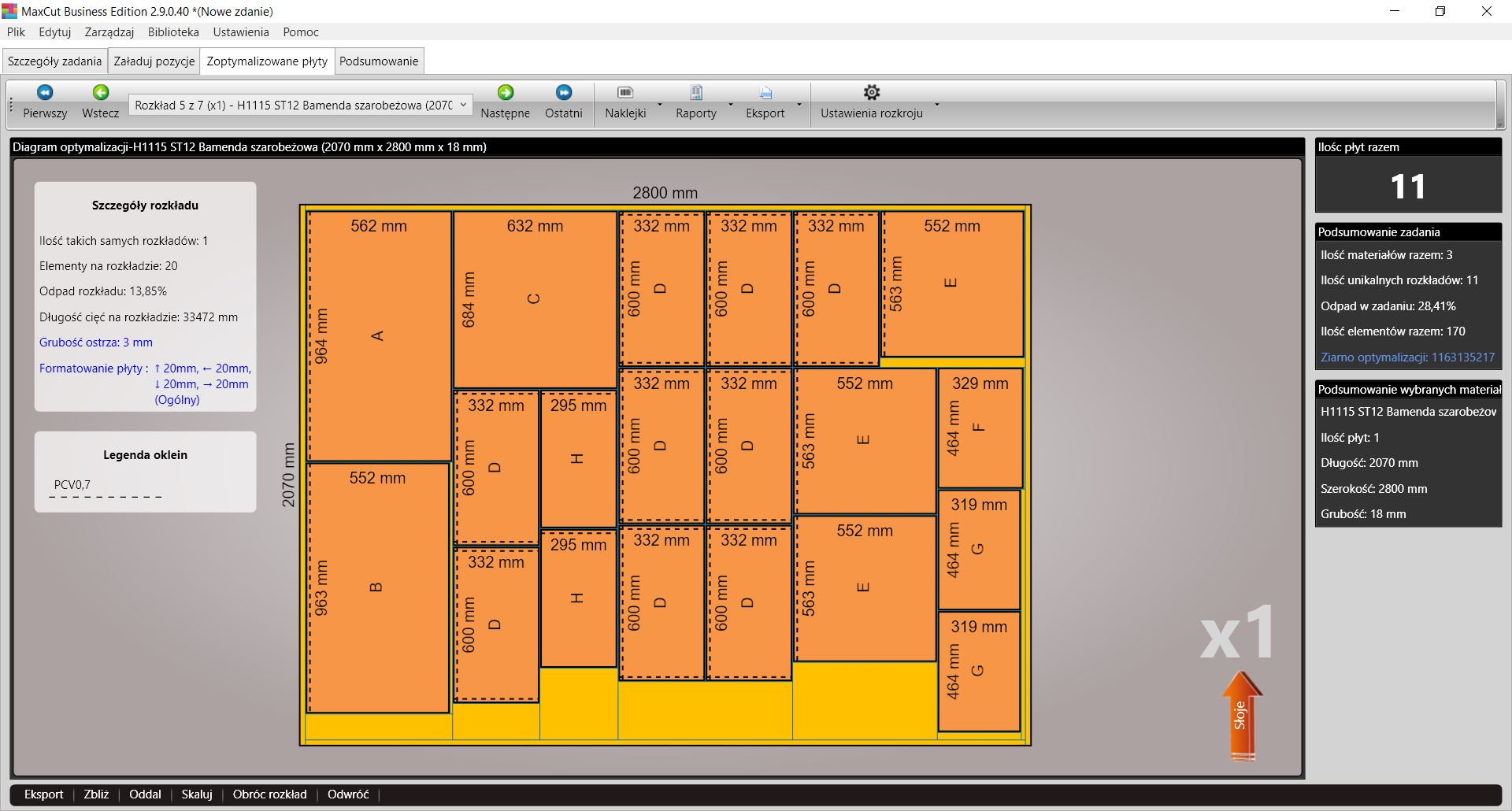 Program optymalizuje cięcie uwzględniając również kierunek usłojenia.